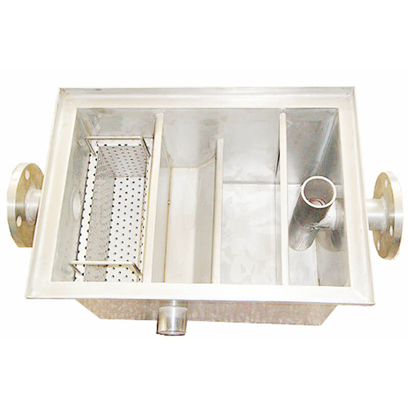 隔油池主要由兩槽'三槽'四槽分別組成,當廚房排水流到第一槽時,雜物框將其中的固體雜物(菜葉等)截流除去,進入第二槽后,利用油水密度差使油水分離。廢水沿第二槽隔油板向下流動,進入第三槽后從物理裝置凈化流出,再經出水管收集排出。第二槽中的油珠顆粒物沿隔油板集聚向上漂浮流動,始終浮在隔油池的第二槽內,經過隔油處理的廢水則溢流入排水渠排出池外,進行后續(xù)處理,以去除乳化油及其他污染物。